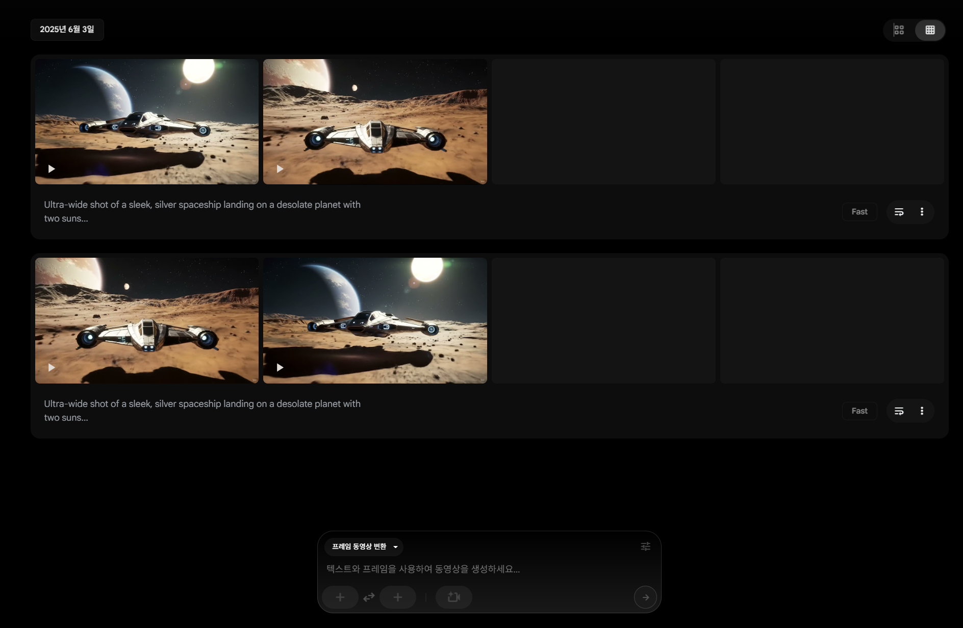 샷 1 프롬프트: Ultra-wide shot of a sleek, silver spaceship landing on a desolate planet with two suns... - 편집 (Editing): Flow 타임라인에 3개 클립을 배열하고, 샷 사이에 '생성형 전환' 효과를 프롬프트로 삽입합니다.